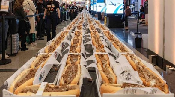 امریکا میں ایک ایئر پورٹ پر چیز اسٹیک کے قومی دن گینیز ورلڈ ریکارڈ توڑ کر منایا گیا۔فلیڈیلفیا انٹرنیشنل ایئر پورٹ پر نیشنل چیز اسٹیک ڈے کے موقع پر چیز اسٹیک کی لمبی قطار بنا کر نیا گینیز ورلڈ ریکارڈ قائم کیا۔منگل کے روز پی ایچ ایل فوڈ اینڈ شاپس کے ایئر پورٹ پر موجود ریستوران نے سٹی آف فلیڈیلفیا ڈیپارٹمنٹ آف ایوی ایشن کے ساتھ مل کر ٹرمنل بی اور سی کے درمیان 1291 چیز اسٹیک کی قطار بنائی۔یہ سینڈوچ 102 کلو چیز ساس اور 449 کلو شیوڈ بیف اور 1291 فٹ لمبے رول سے بنائے گئے۔گینیز ورلڈ ریکارڈز کے اہلکار موقع پر موجود تھے جنہوں نے اس بات کی تصدیق کی سینڈوچ کی قطار ریکارڈ بنانے کے لیے کافی تھی۔