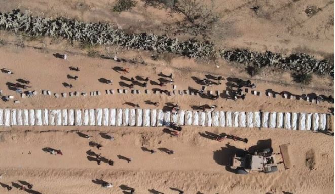 غزہ کے علاقے دیر البلاح میں 54 شہدا کو ایک مقامی قبرستان میں اجتماعی قبر میں دفن کیا گیا ہے۔میڈیا رپورٹس کے مطابق شہدا کی لاشیں معاہدے کے تحت اسرائیل کی طرف سے فلسطین کو واپس کی گئی تھیں۔یہ لاشیں اُن 145 فلسطینی افراد میں شامل ہیں جنہیں اسرائیل نے ایک معاہدے کے تحت واپس کیا۔ واپسی کے بعد تشخیصی مراحل کے دوران یہ 54 لاشیں شناخت کے قابل نہ ہونے کی بنا پر اجتماعی قبر میں دفن کی گئیں۔فلسطینی اتھارٹی کا کہنا ہے کہ ان لاشوں کے جسموں پر تشدد، اندھا فائرنگ اور قریبی فاصلے سے شیلنگ کے نشانات موجود تھے جنہیں “میدانی ایگزیکیوشن” کا ثبوت قرار دیا گیا ہے۔دوسری جانب اسرائیل نے ان الزامات کو مسترد کیا ہے اور کہا ہے کہ وہ بین الاقوامی قانون کی پابندی کرتا ہے۔