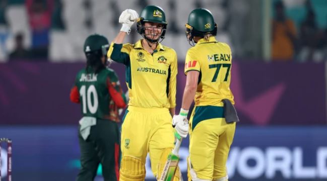 دفاعی چیمپئن آسٹریلیا نے بنگلادیش کے خلاف 10 وکٹوں سے شاندر فتح حاصل کرکے ویمنز ورلڈ کپ کے سیمی فائنل میں قدم رکھ دیے۔وشاکا پٹنم میں کھیلے گئے میچ میں بنگلا دیش کی جانب سے ٹاس جیت کر پہلے بیٹنگ کا فیصلہ خاص موثر ثابت نہ ہوا۔بنگلادیش کی ٹیم ابتداء سے ہی مشکلات کا شکار رہی اور مقررہ اوورز میں 9 وکٹوں کے نقصان پر 198 رنز بناسکی۔سوبھانا موستاری نے 66 رنز کی ناقابل شکست اننگز کھیلی جبکہ روبیا حیدر 44 رنز بناکر نمایاں رہیں۔آسٹریلیا کی جانب سے الانا کنگ، ایشلے گارڈنر، اینابل سدرلینڈ اور جارجیا ویئرہم نے دو دو شکار کیے جبکہ میگن اسکٹ نے ایک وکٹ حاصل کی۔جواب میں آسٹریلوی اوپنرز نے انتہائی جارحانہ انداز اپنایا۔ کپتان الیسا ہیلی نے صرف 77 گیندوں پر 113 رنز کی برق رفتار اننگز کھیلی جس میں 20 چوکے شامل تھے۔فیبی لچ فیلڈ نے 72 گیندوں پر 84 رنز بنائے۔ انہوں نے 12 چوکے اور ایک چھکا لگایا۔دونوں بیٹرز نے 202 رنز جوڑ کر ٹیم کو صرف 24.5 اوورز میں فتح دلا دی۔اس فتح کے ساتھ آسٹریلیا رواں ایونٹ میں سیمی فائنل میں پہنچنے والی پہلی ٹیم بن گئی ہے۔