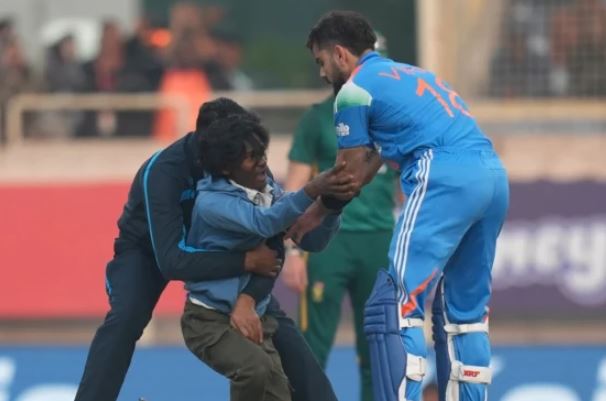 بھارت اور جنوبی افریقا کے درمیان پہلے ون ڈے میچ کے دوران سیکیورٹی کی سنگین ناکامی اس وقت سامنے آئی جب ایک شخص حفاظتی رکاوٹیں توڑ کر میدان میں داخل ہوگیا اور پچ پر موجود ویرات کوہلی سے جا لپٹا۔بھارت کے مایہ ناز بیٹسمین ویرات کوہلی نے جنوبی افریقا کے خلاف پہلے ون ڈے میں 135 رنز کی اننگز کھیل کر اپنی 52 ویں ون ڈے سنچری بنا لی۔جیسے ہی انہوں نے سنچری مکمل کی تو ایک شائق نہ صرف سیکیورٹی توڑ کر میدان میں داخل ہوا بلکہ سیدھا کوہلی کے قدموں میں جا گرا۔ کرکٹ حلقوں کے مطابق جشن مناتے وقت اچانک فین کا میدان میں گھس آنا کھلاڑیوں کی جان کو خطرے میں ڈالنے کے مترادف ہے جبکہ بھارتی کرکٹ بورڈ اس سنگین معاملے پر اب تک کوئی واضح مؤقف دینے میں ناکام رہا ہے۔